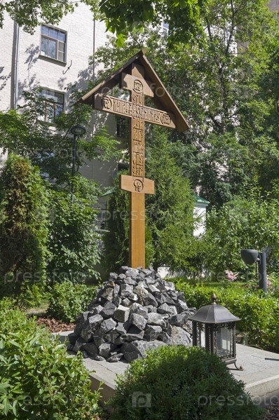 Деревянный поклонный крест во дворе храма Священномученика Власия в Старой Конюшенной слободе. Москва, угол Гагаринского и Большого Власьевского переулков. Солнечный день в июле