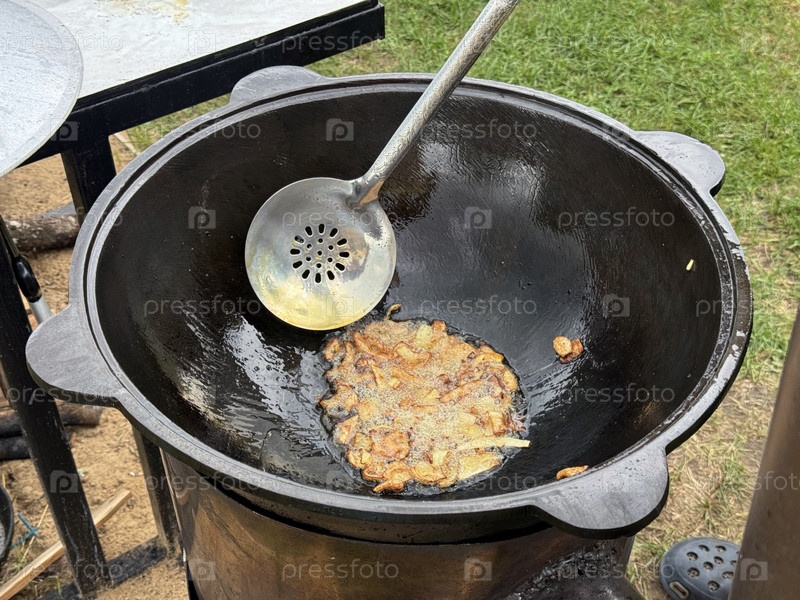 Мужчина жарит лук в масле на горячем гриле. Мангал на открытом огне. Крупный план
