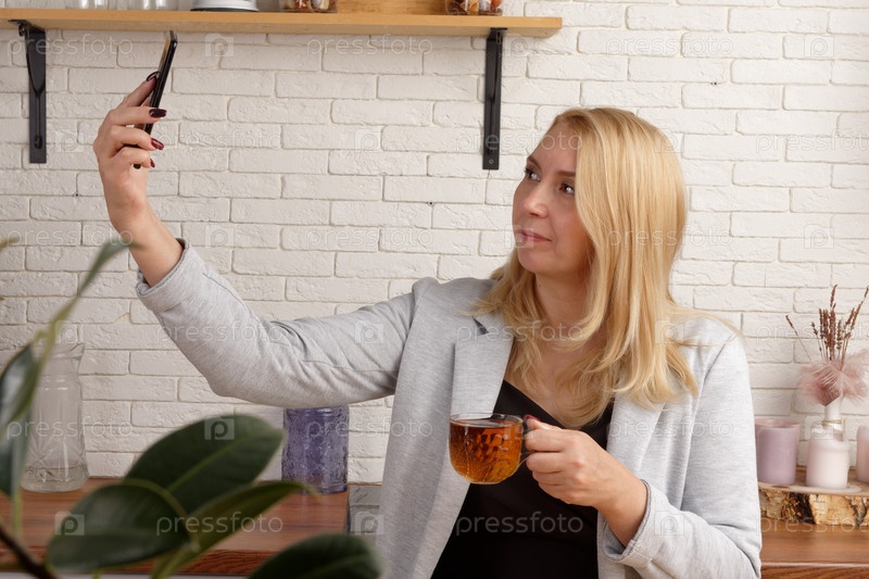 Деловая женщина средних лет делает перерыв на чай и с улыбкой смотрит на экран телефона