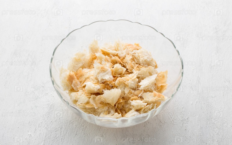 Стеклянная миска с кусочками слоеного теста для вкусного арабского десерта Умм Али или другого блюда на светло-сером фоне. Этап приготовления