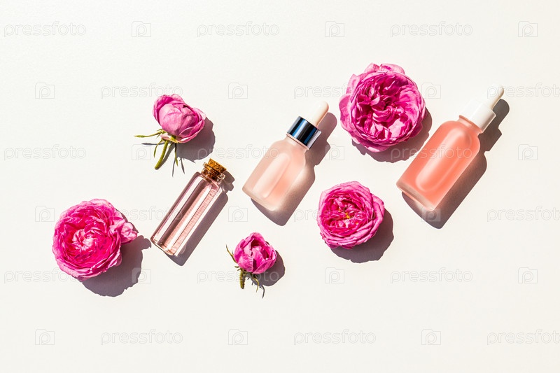 Набор косметики для увлажнения, омоложения кожи лица и тела на основе масел лепестков роз в различных косметических флаконах. вид сверху