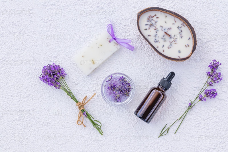 Набор косметики для спа, ароматерапии, ухода за лицом и телом на основе экстракта лаванды на белом фоне среди веточек свежей лаванды