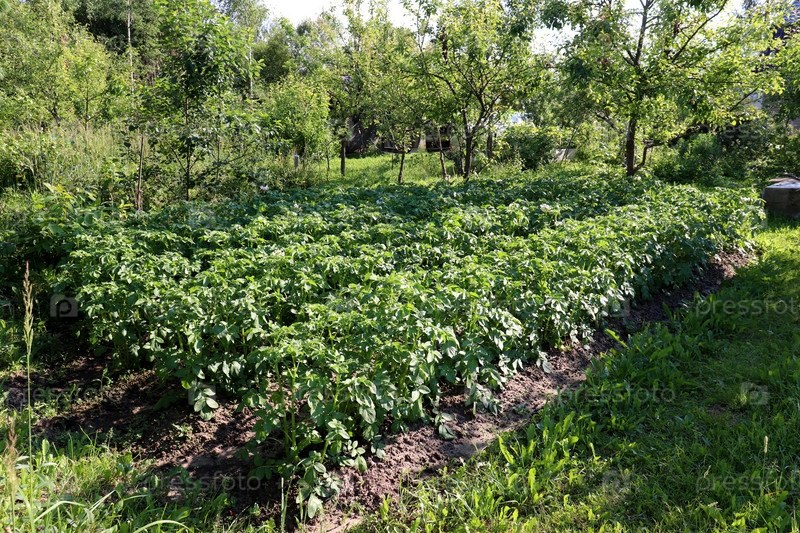 Грядки с картофелем на фоне фруктового сада в солнечный день
