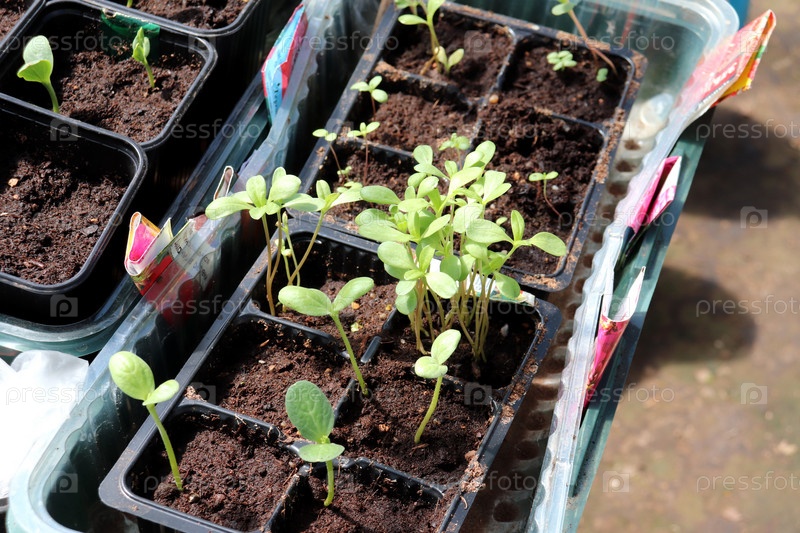 Рассада цветов цинний в пластиковых стаканах в теплице