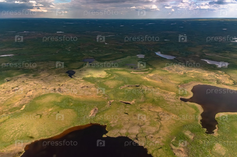 Арктическая тундра летом с высоты 2000 метров. Облачное небо. Разнообразие цветов и пейзажей. Просторы первозданной природы. Тень от облаков