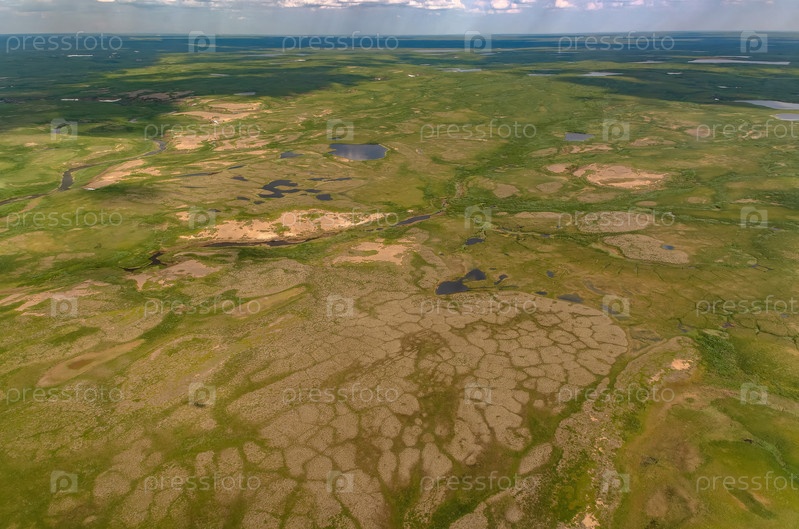 Арктическая тундра летом с высоты 2000 метров. Облачное небо. Разнообразие цветов и пейзажей. Просторы первозданной природы. Тень от облаков