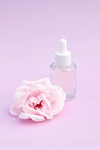Стеклянный косметический флакон с капельницей на розовом фоне с цветущим розовым цветком розы. Концепция натуральной косметики, натуральное эфирное масло и средства по уходу за кожей