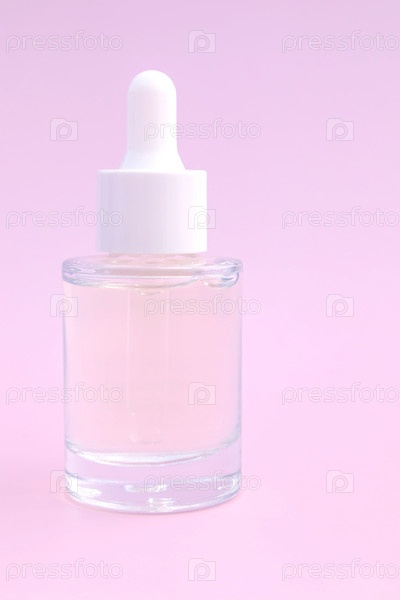 Вид сбоку на стеклянную бутылку-капельницу с косметическим маслом для лица на розовом фоне. антивозрастная сыворотка с натуральными ингредиентами