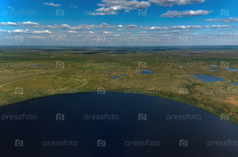 Арктическая тундра летом с высоты 2000 метров. Облачное небо. Разнообразие цветов и пейзажей. Просторы первозданной природы. Тень от облаков