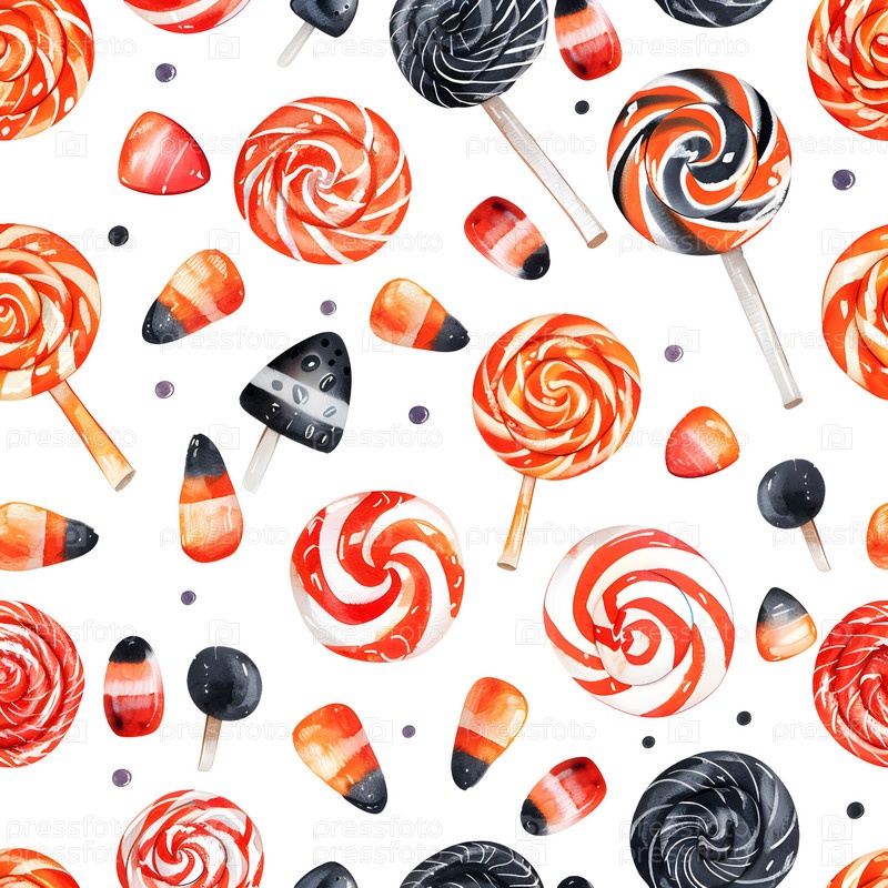 Акварель праздничный Хэллоуин бесшовный узор с расписанными вручную сладостями и угощениями на белом фоне. Вихревые леденцы, леденцы, спиральные конфеты, жевательные шарики
