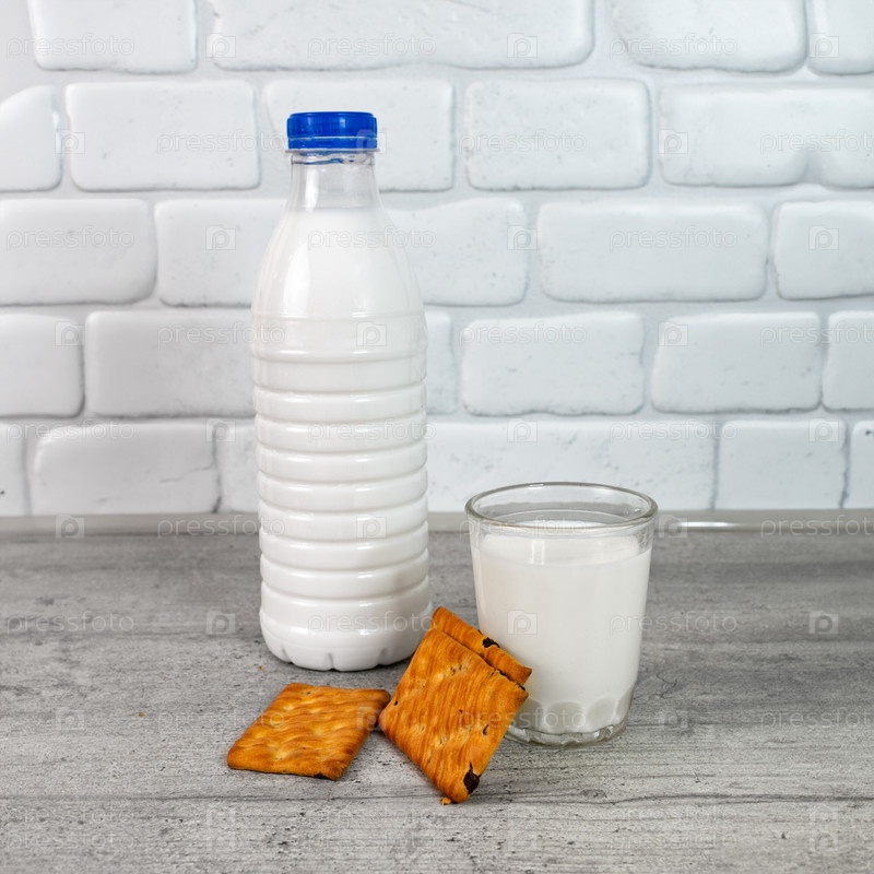 Бутылка и стакан молока с печеньем на кухонном столе