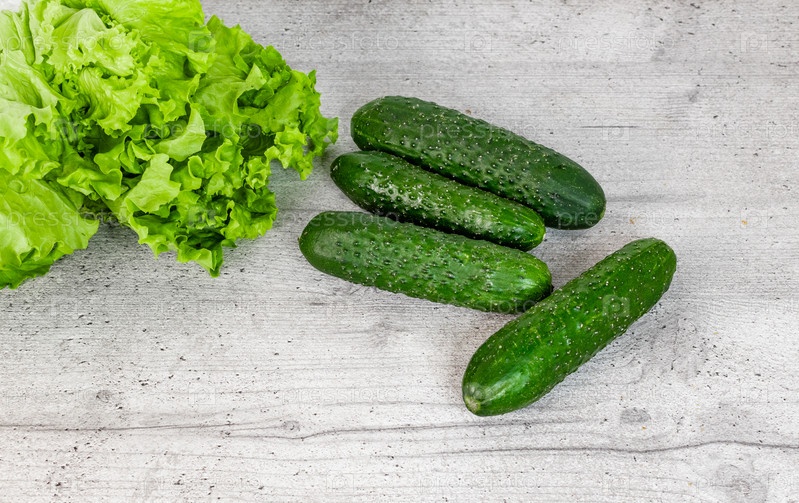 Огурцы и салат на кухонном столе