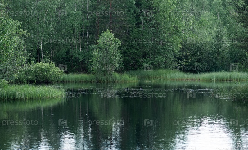 Красивое летнее спокойное озеро с птицами в зеленом лесу