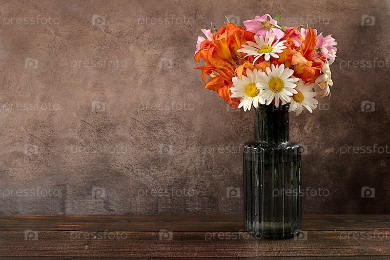 Натюрморт с цветами лилий, маргариток и мальвы на старом деревянном столе, летний и осенний баннер для рекламы продукта, абстрактная цветочная композиция, деревенский стиль, праздничная открытка,
