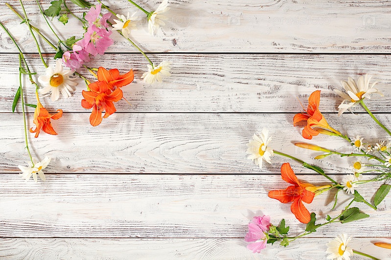 Цветы лилий, ромашек и мальв на старом деревянном фоне, летний и осенний баннер для рекламы продукции, абстрактная цветочная композиция, деревенский стиль, праздничная открытка,