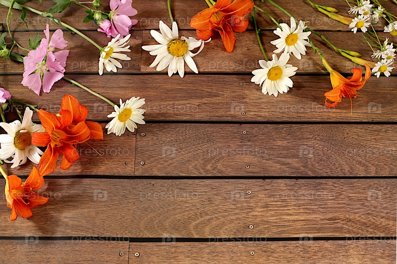 Цветы лилий, ромашек и мальв на старом деревянном фоне, летний и осенний баннер для рекламы продукции, абстрактная цветочная композиция, деревенский стиль, праздничная открытка,