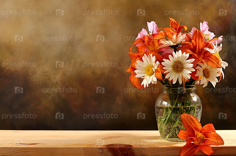 Натюрморт с цветами лилий, маргариток и мальвы на старом деревянном столе, летний и осенний баннер для рекламы продукта, абстрактная цветочная композиция, деревенский стиль, праздничная открытка,