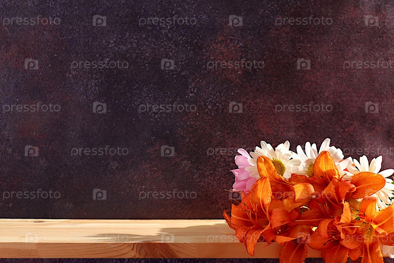 Пустой деревянный стол с лилиями, маргаритками, цветами мальвы, летним и осенним баннером для рекламы продукции, абстрактной цветочной композицией, деревенским стилем, праздничной открыткой,