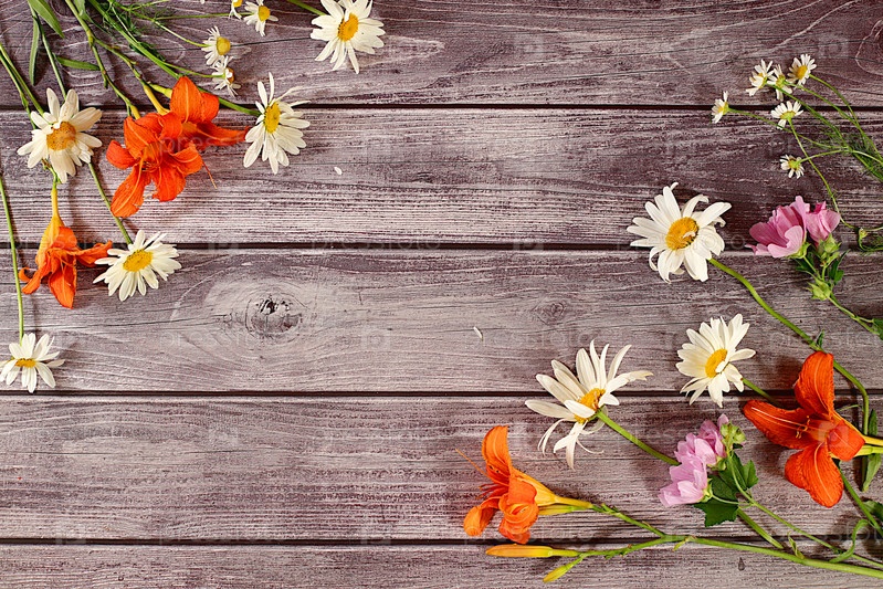 Цветы лилий, ромашек и мальв на старом деревянном фоне, летний и осенний баннер для рекламы продукции, абстрактная цветочная композиция, деревенский стиль, праздничная открытка,