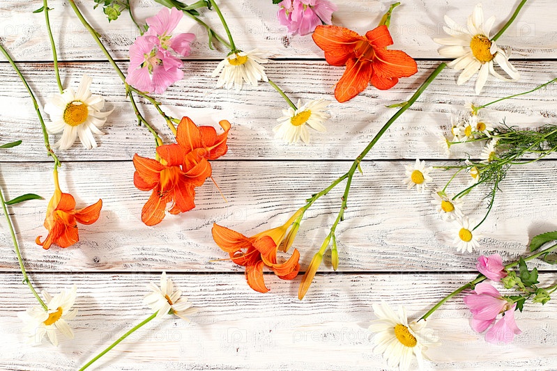 Цветы лилий, ромашек и мальв на старом деревянном фоне, летний и осенний плоский баннер, абстрактная цветочная композиция, деревенский стиль, праздничная открытка