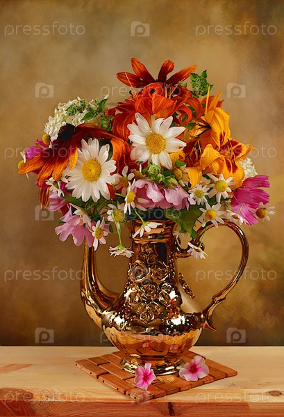 Абстрактная цветочная композиция. Натюрморт с букетом цветов гортензии, лилий, ромашки и мальвы на старом деревянном столе, летний и осенний баннер, деревенский стиль, праздничная открытка,