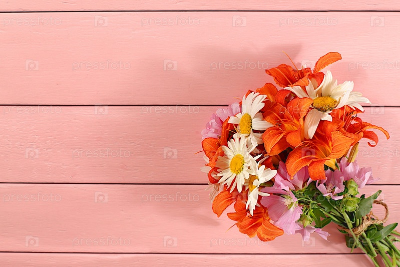 Букет цветов лилии и мальвы на деревянном фоне, летний и осенний баннер для рекламы продукции, абстрактная цветочная композиция, деревенский стиль, праздничная открытка,