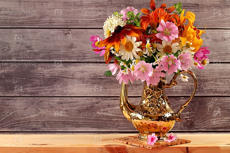 Абстрактная цветочная композиция. Натюрморт с букетом цветов гортензии, лилий, ромашки и мальвы на старом деревянном столе, летний и осенний баннер, деревенский стиль, праздничная открытка,