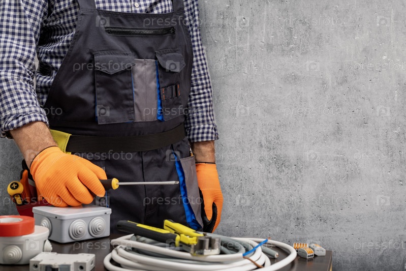 Инженер-электрик работает с электрическими кабельными проводами, электрооборудованием, используя отвертку