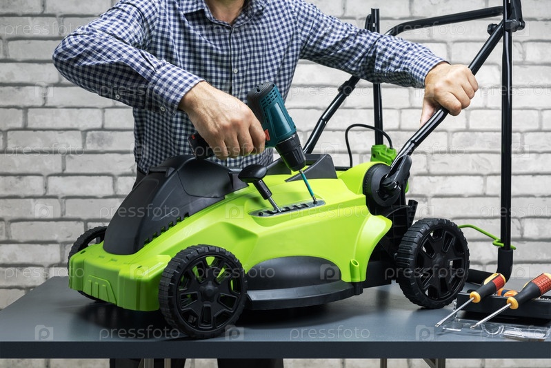 Мужчина, военнослужащий ремонтирует газонокосилку в мастерской