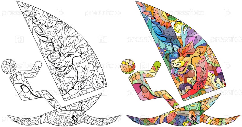 Иконка ПАРУСЬ в стиле абстрактного ручного рисунка для раскраски. Набор цветов и контуров