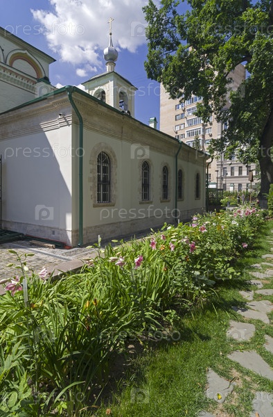 Цветник во дворе храма Священномученика Власия в Старой Конюшенной слободе. Москва, угол Гагаринского и Большого Власьевского переулков. Солнечный день в июле. Солнечный день в июле