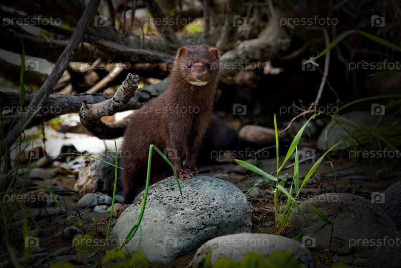 Россия, Горный Алтай. Любопытная норка позирует возле своего жилища в таежной глуши
