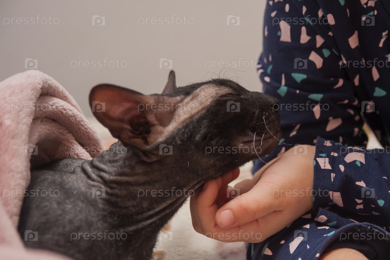 Кот сфинкс темного окраса греется в ласках человека