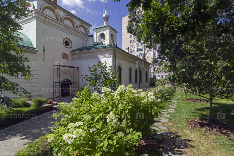 Цветник во дворе храма Священномученика Власия в Старой Конюшенной слободе. Москва, угол Гагаринского и Большого Власьевского переулков. Солнечный день в июле. Солнечный день в июле