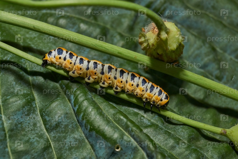 Гусеница бабочки (лат. Cucullia Lactucae) питается бутонами цветов чертополоха