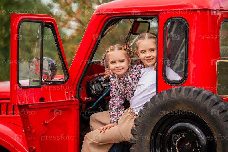 Две веселые девушки сидят в салоне старого винтажного красного внедорожника