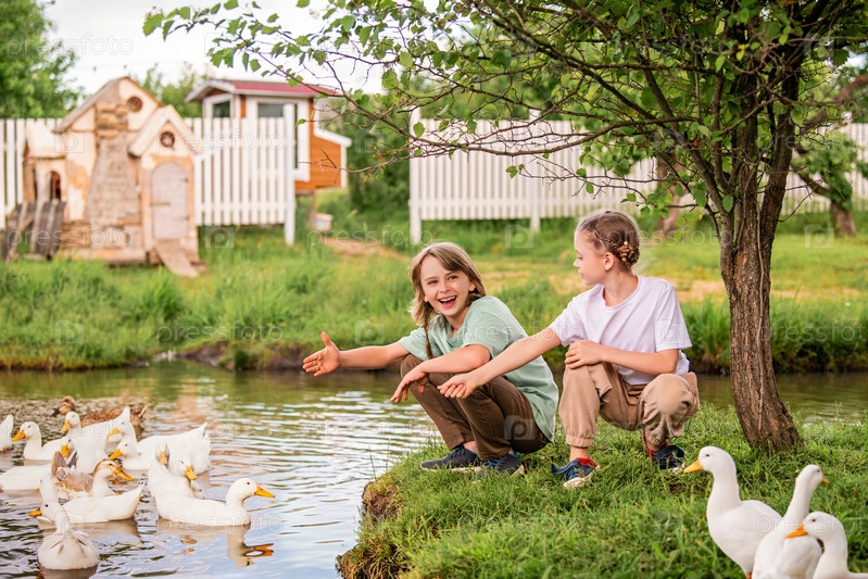Дети кормят гусей на птичьем дворе в сельском хозяйстве