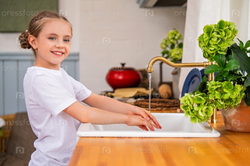Ребенок моет руки под латунным краном в интерьере кухни загородного дома