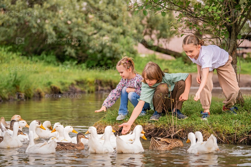 Дети кормят гусей на птичьем дворе в сельском хозяйстве. В пруду плавают белые гуси и утки