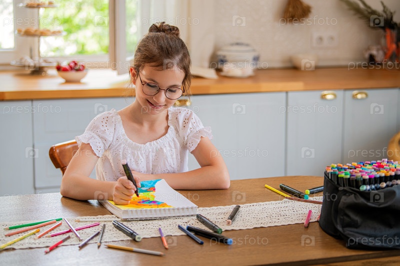 Девушка рисует в альбоме цветными карандашами, сидя за столом в интерьере кухни загородного дома. Развитие творческих способностей ребенка на каникулах