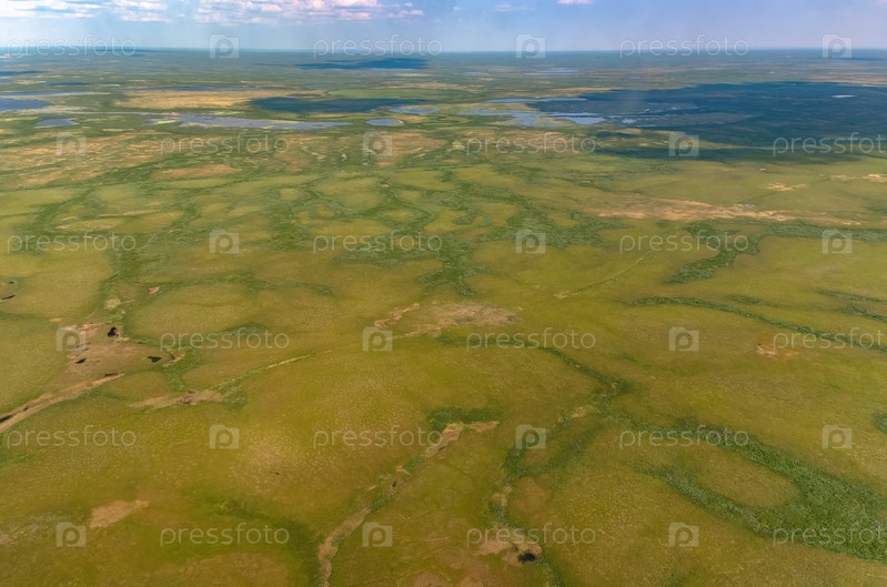 Арктическая тундра летом с высоты 2000 метров. Облачное небо. Разнообразие цветов и пейзажей. Просторы первозданной природы. Тень от облаков