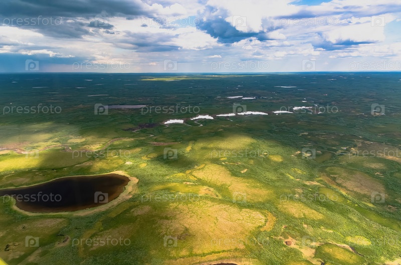 Арктическая тундра летом с высоты 2000 метров. Облачное небо. Разнообразие цветов и пейзажей. Просторы первозданной природы. Тень от облаков