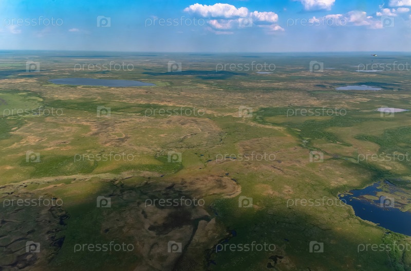 Арктическая тундра летом с высоты 2000 метров. Облачное небо. Разнообразие цветов и пейзажей. Просторы первозданной природы. Тень от облаков