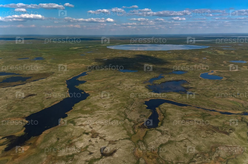 Арктическая тундра летом с высоты 2000 метров. Облачное небо. Разнообразие цветов и пейзажей. Просторы первозданной природы. Тень от облаков