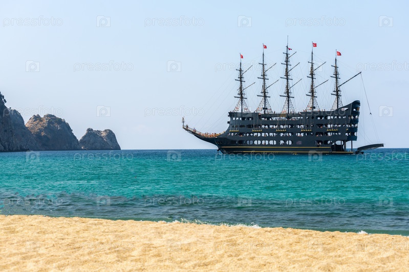 Пиратский круизный корабль с туристами в море возле пляжа Клеопатры, Алания, Турция