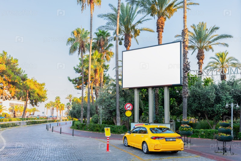 Макет пустого белого рекламного щита на пальмах, фоне голубого неба. Автомобиль такси возле пустого рекламного щита