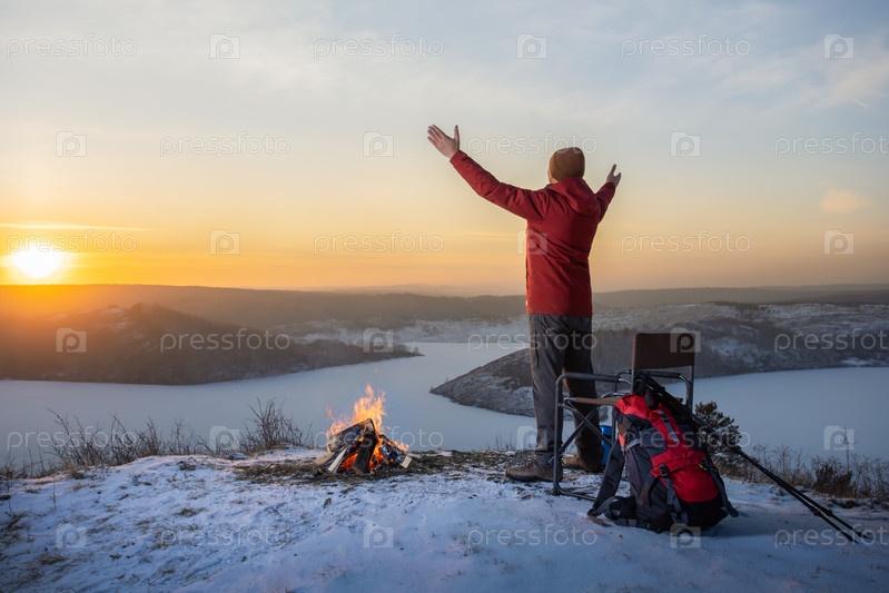 Счастливый турист, наслаждающийся закатом на зимней природе. приключения, свобода, концепция походов