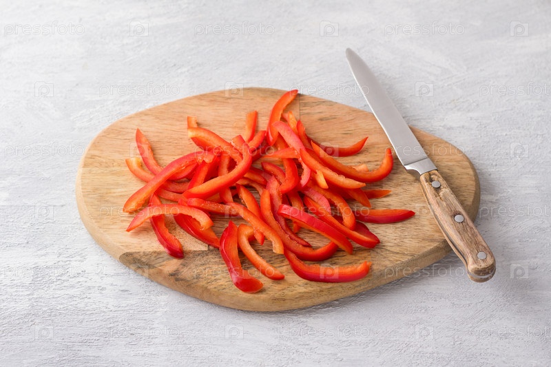 Деревянная доска с нарезанным сладким красным перцем на светло-сером фоне, вид сверху. Этап приготовления здоровой веганской еды