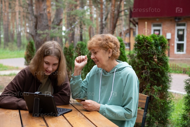 Счастливая зрелая бабушка с внучкой, использующая кредитную карту, делает покупки в Интернете на ноутбуке