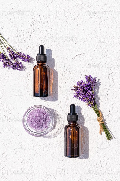 Косметическое лавандовое масло, сыворотка, экстракт, соль на белом вертикальном фоне. Концепция спа, ароматерапии, красоты и ухода. Копировальное пространство. вид сверху